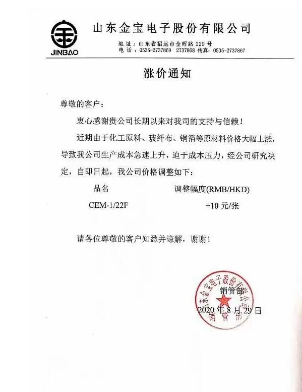 随后,山东金宝电子在8月29日发出涨价通知表示,由于化工原料、玻纤布、铜箔等原材料价格大幅上涨,倒逼生产成本急速上升,迫于成本压力,公司决定自即29日起,CEM-1/22F加价10元/张: